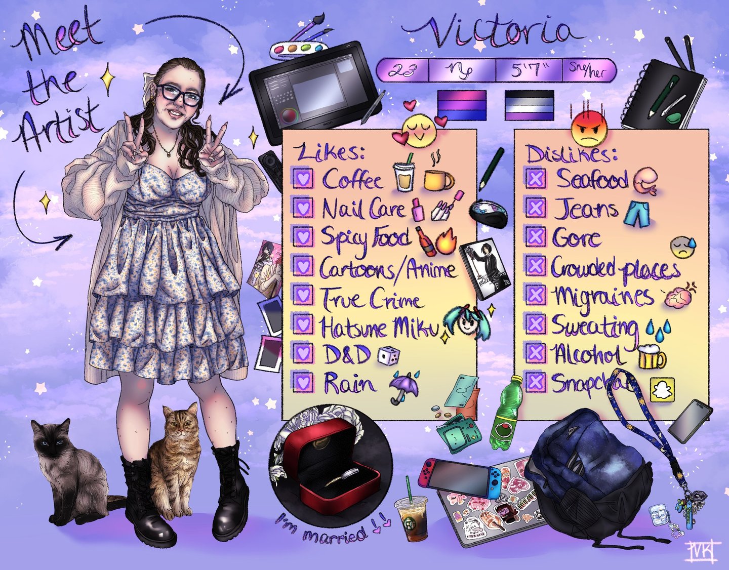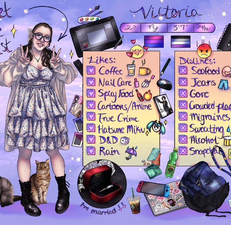 This was an illustration I made in Clip Studio Paint based off of an art trend called, "Meet the Artist" where artists would draw portraits of themselves while including details about their interests and personal life.